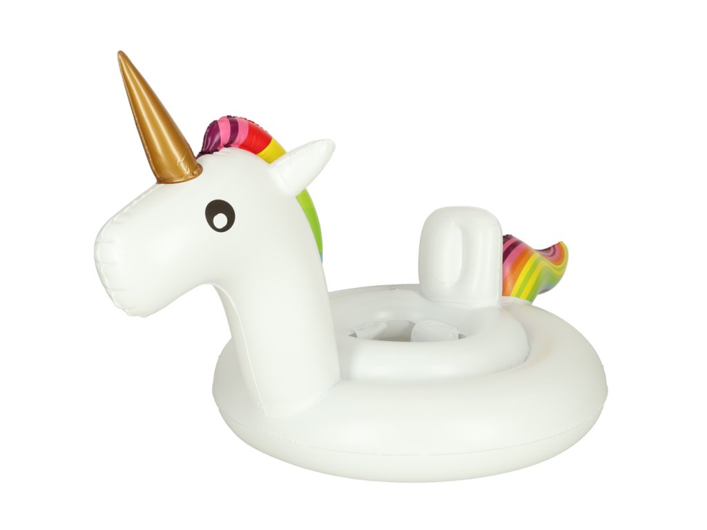 Nafukovacie koleso so sedadlom pre deti v tvare jednorožca, vyrobené z kvalitného PVC plastu, ktorý zaručuje odolnosť.