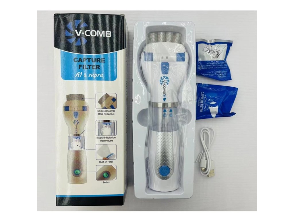 Elektrický odvšivovací hrebeň V-Comb s vákuom – odstráni vši aj hnidy bez chémie. LED osvetlený filter, nerezové čepele, sieťové napájanie. Bezpečný pre deti, účinný pre celú rodinu.