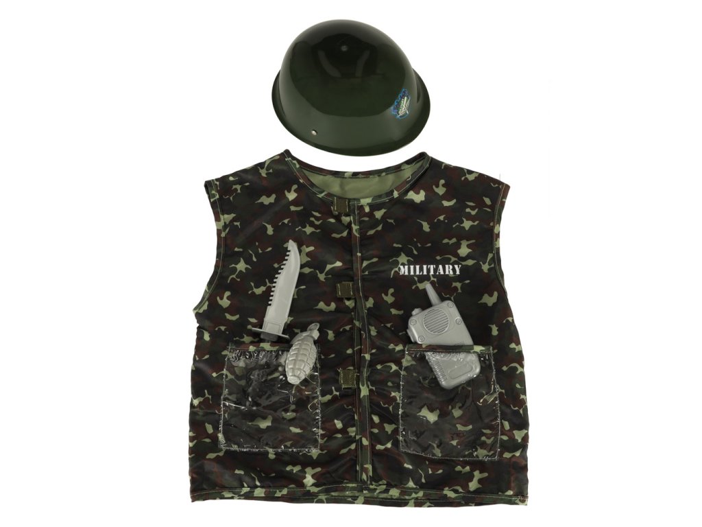 Súprava obsahuje vestu so vzorom moro a vojenskú prilbu!