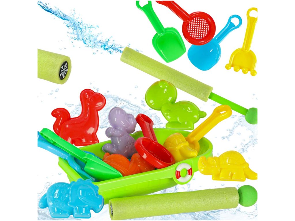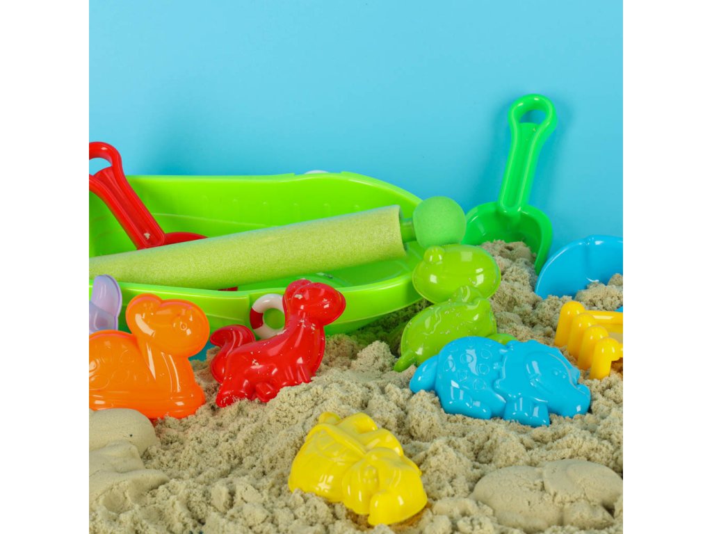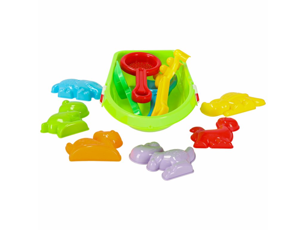Súprava obsahuje šesť formičiek v tvare zvieratiek, dva druhy lopatiek, hrabličky a sitko, ktoré uľahčujú preosievanie piesku a stavanie hradov. Priložená loďka sa navyše bude hodiť na hru s vodou a vodná pištoľ, ktorá sa plní ako striekačka, poskytne ešte viac zábavy.
