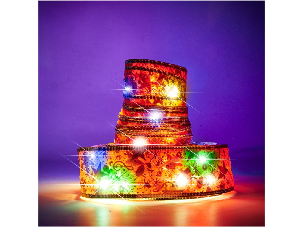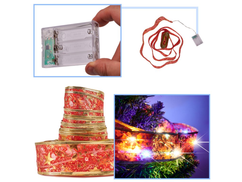 Vianočná LED stuha na vianočný stromček. Dodá slávnostný nádych každému interiéru! 8 režimov osvetlenia. Napájanie: 3 batérie AA. Farba: stuha - červená, svetlá - viacfarebné. Počet svetiel: 100LED. Dĺžka: 10 m.